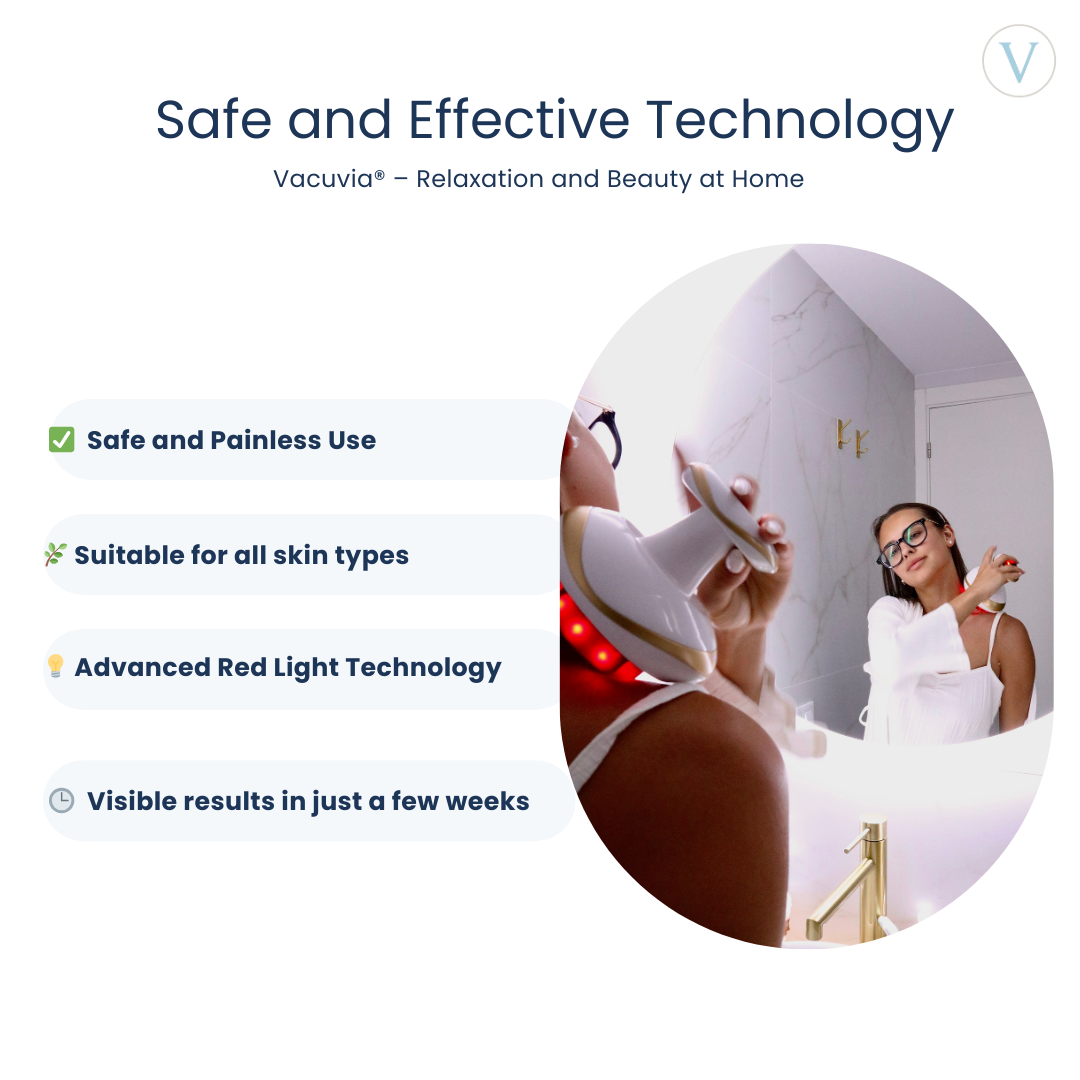 Vacuvia SculptGlow is designed for safe, gentle home use and is suitable for all skin types. Always keep the device moving and do not stay in one spot for too long. Avoid broken or irritated skin and talk to your doctor before use if you are pregnant, have a serious medical condition, or use implanted devices. Wipe the head clean after each use and store it in a dry place.